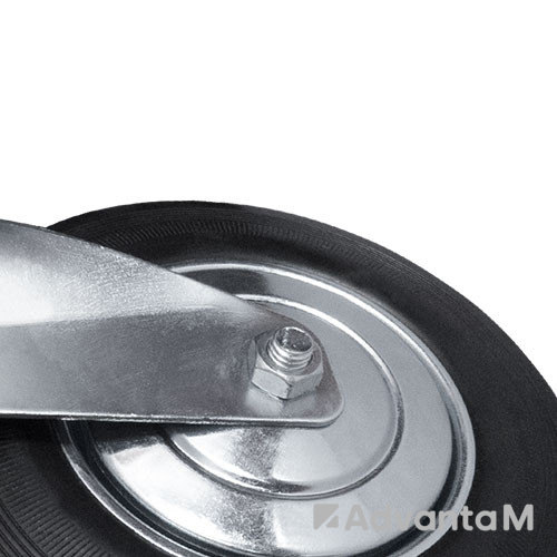 Промышленное поворотное колесо серии SС – одно из самых востребованных в серии. Обод, поворотный кронштейн, площадка и защитные диски из оцинкованной стали, устойчивой к коррозии. Ширина обода 30 мм. Материал шинки – чёрная литая резина, обеспечивающая тихое и плавное движение. Роликовый подшипник в ступице защищен от попадания пыли специальными колпаками.