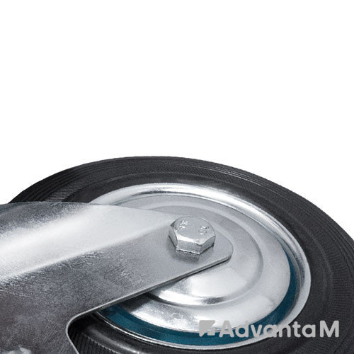 Промышленное поворотное колесо с тормозом имеет обод из оцинкованной стали и литую шинку из чёрной резины. Диаметр колеса 125 мм, высота колесной опоры с кронштейном 150 мм. Для крепления к оборудованию предусмотрен кронштейн с платформой размером 102x84 мм. Расстояние между центрами отверстий 80x60 мм. Грузоподъемность 100 кг. В оси роликовый подшипник, в поворотном узле – двухрядный шарикоподшипник с пластиковым пыльником.