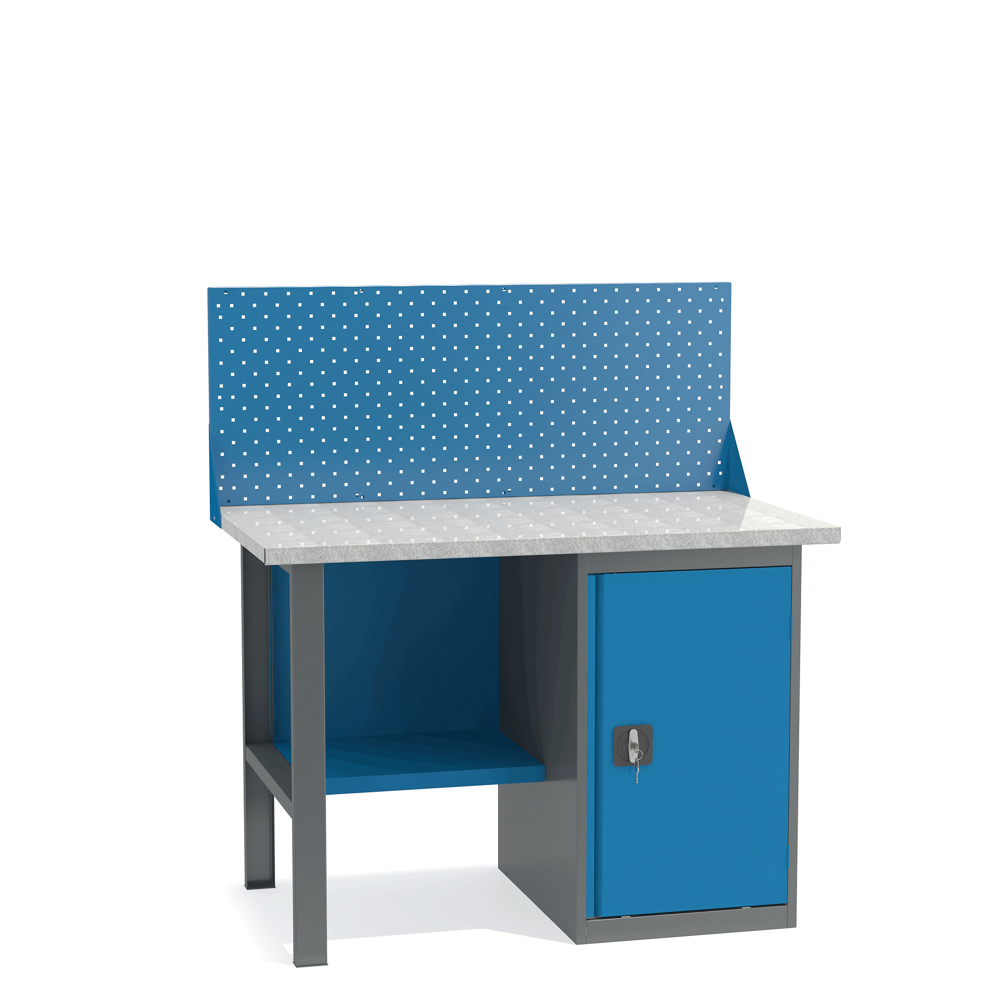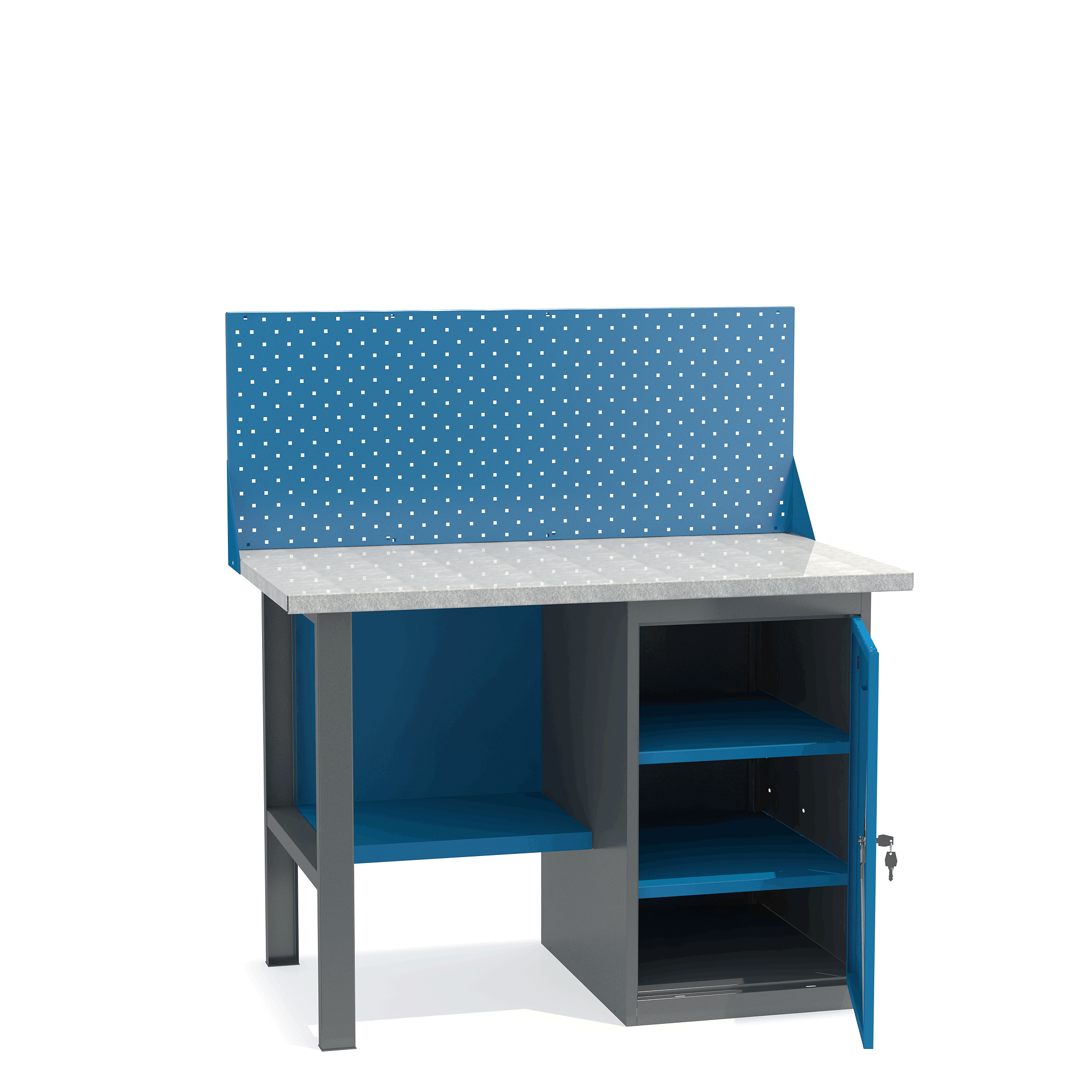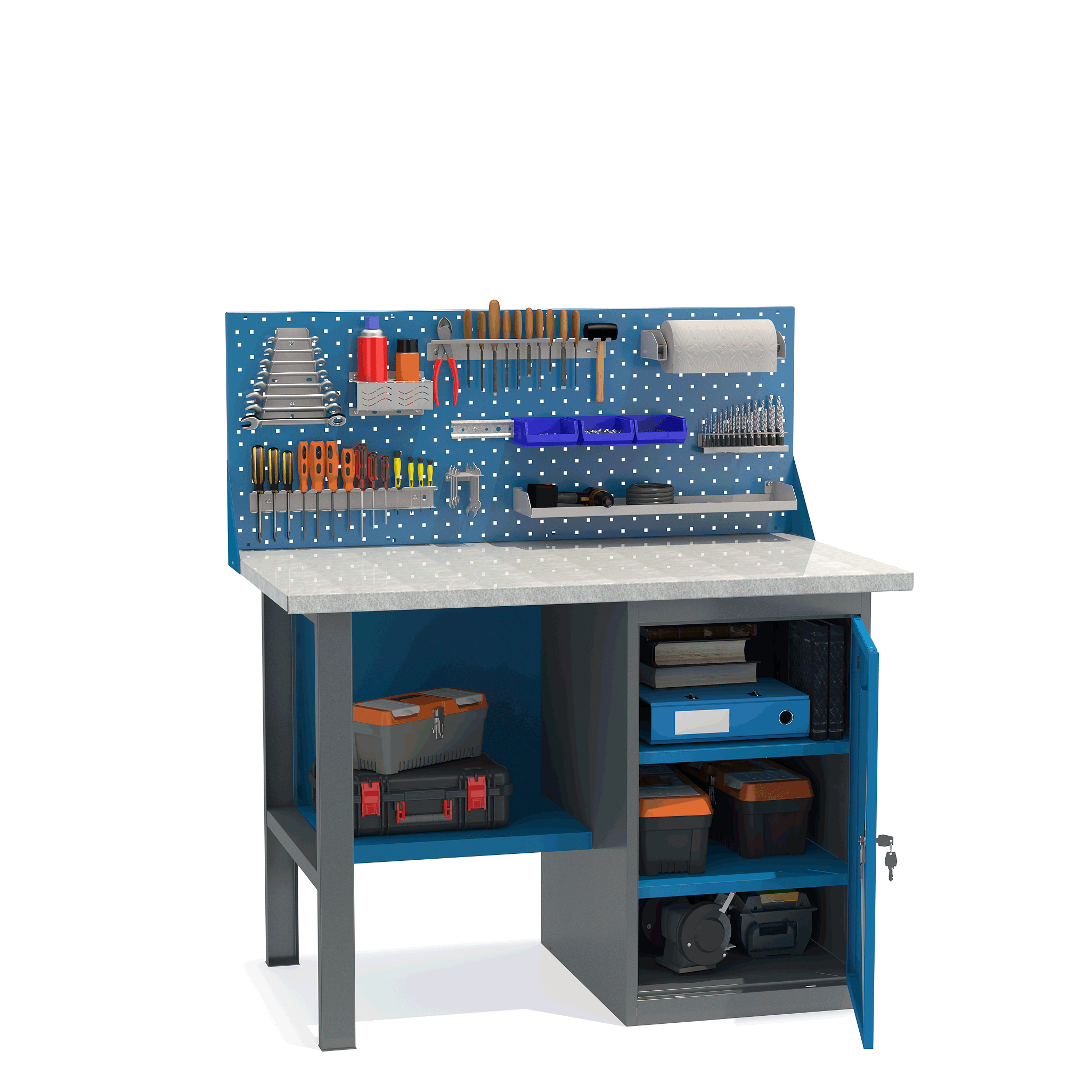 - Верстак укомплектован тумбой с полками.
