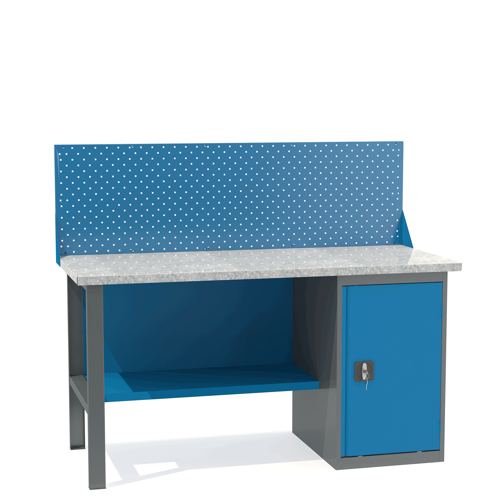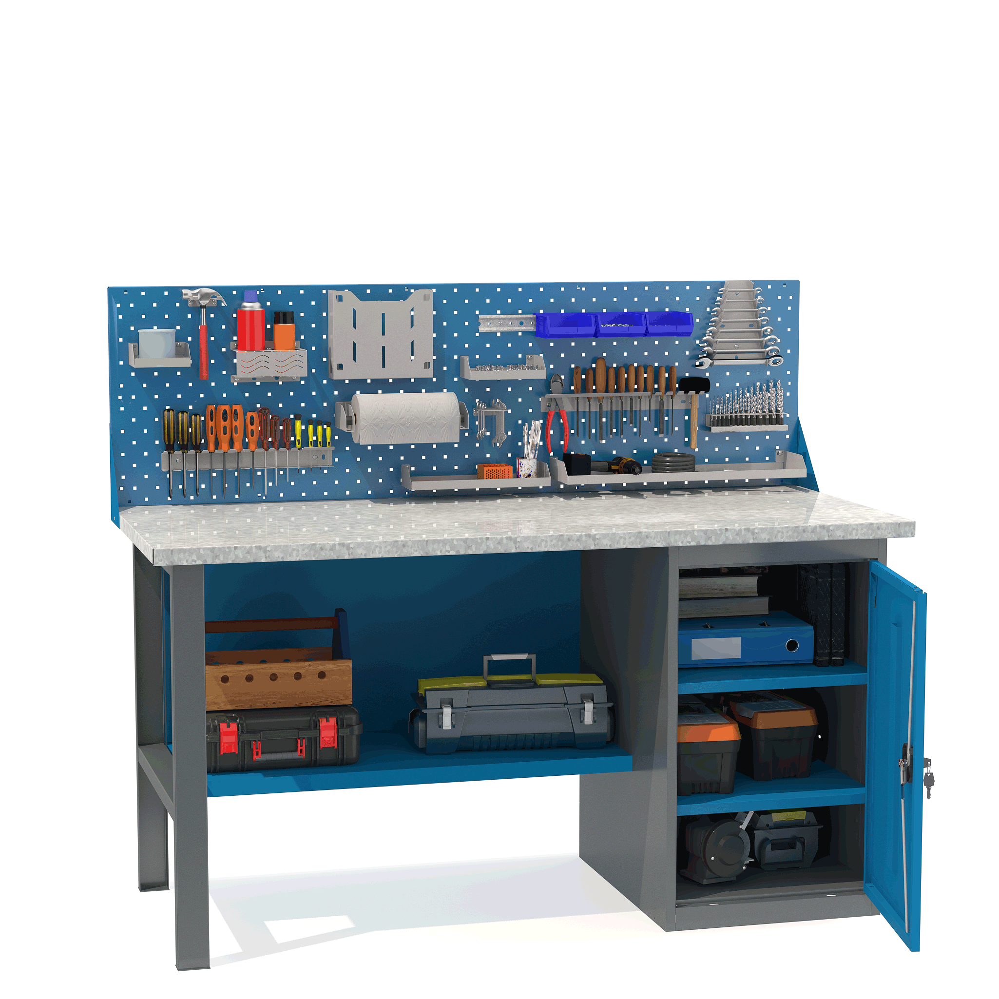 - Верстак укомплектован тумбой с полками.