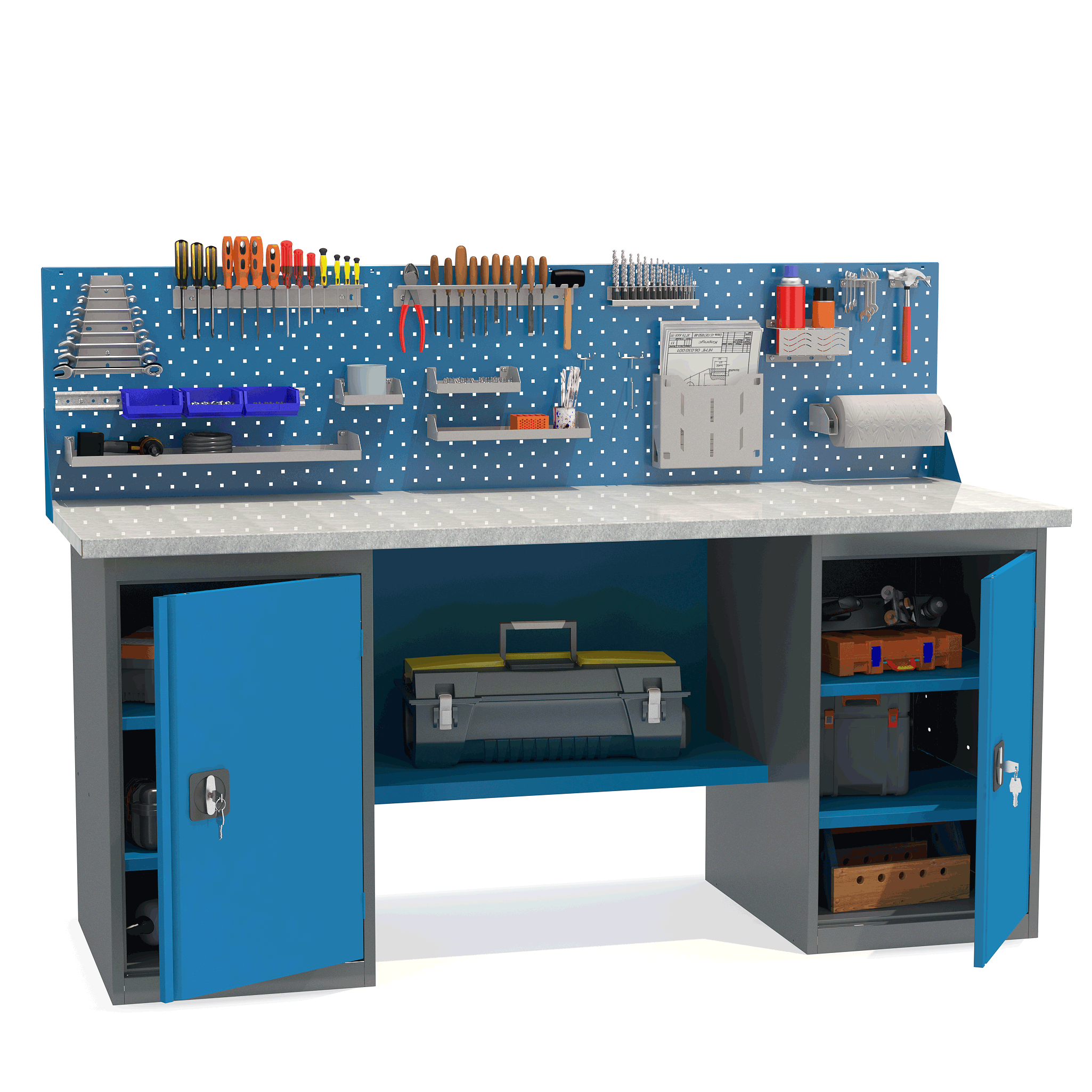 - Верстак укомплектован двумя тумбами с полками.