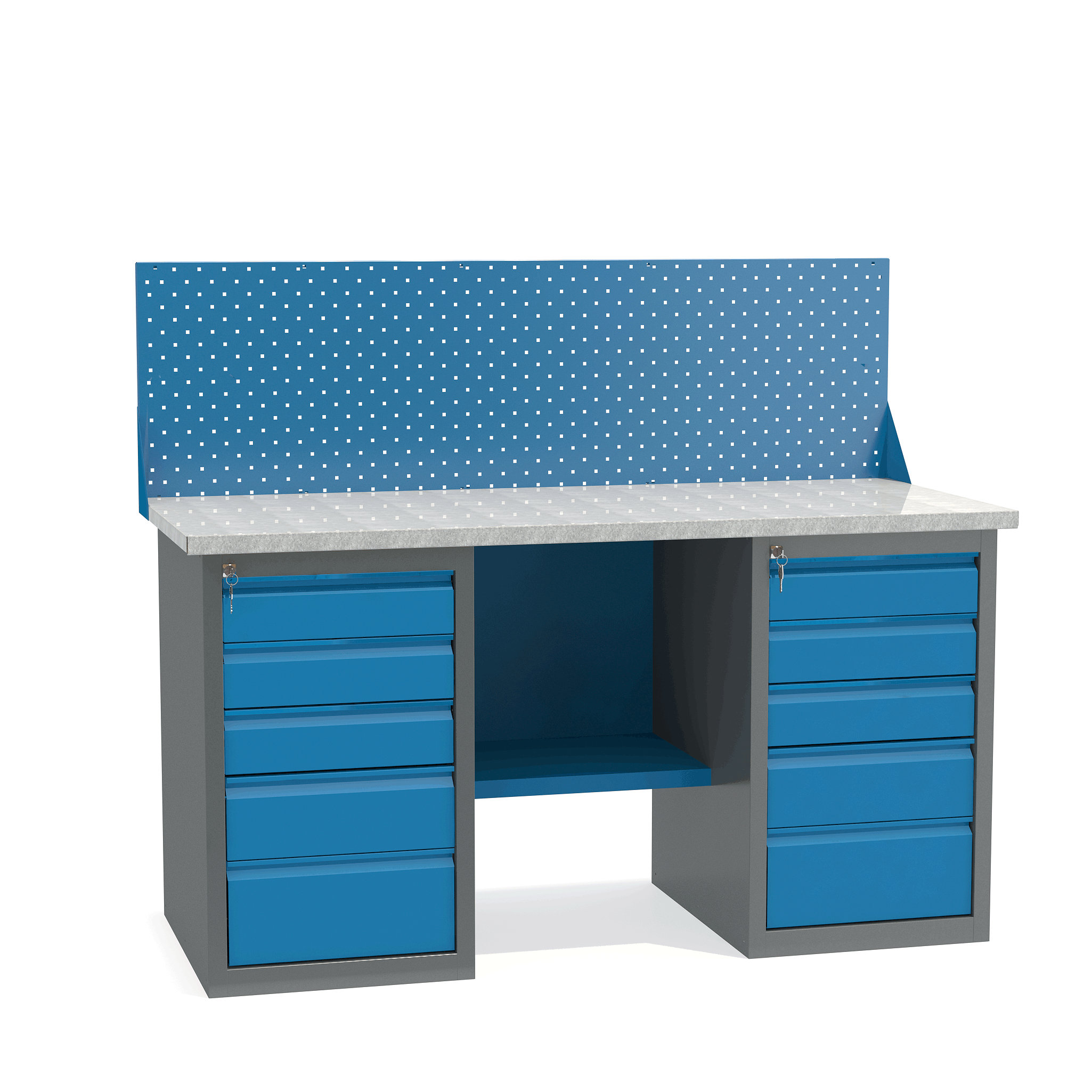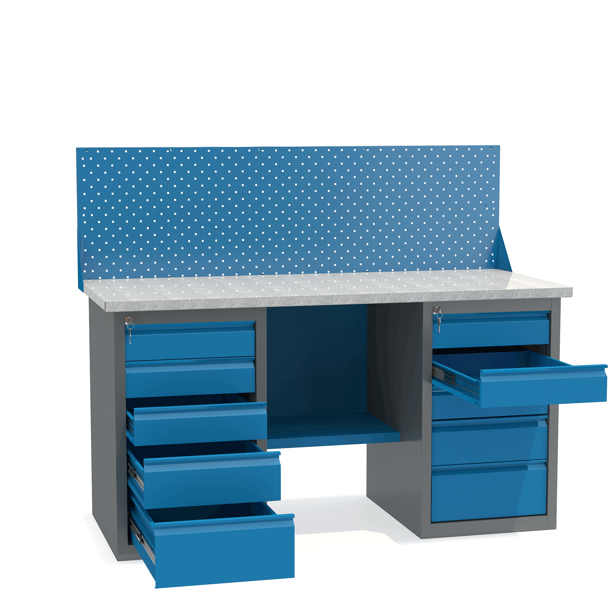- Верстак укомплектован двумя драйверами, каждый из которых оснащен пятью выдвижными ящиками разными по высоте.