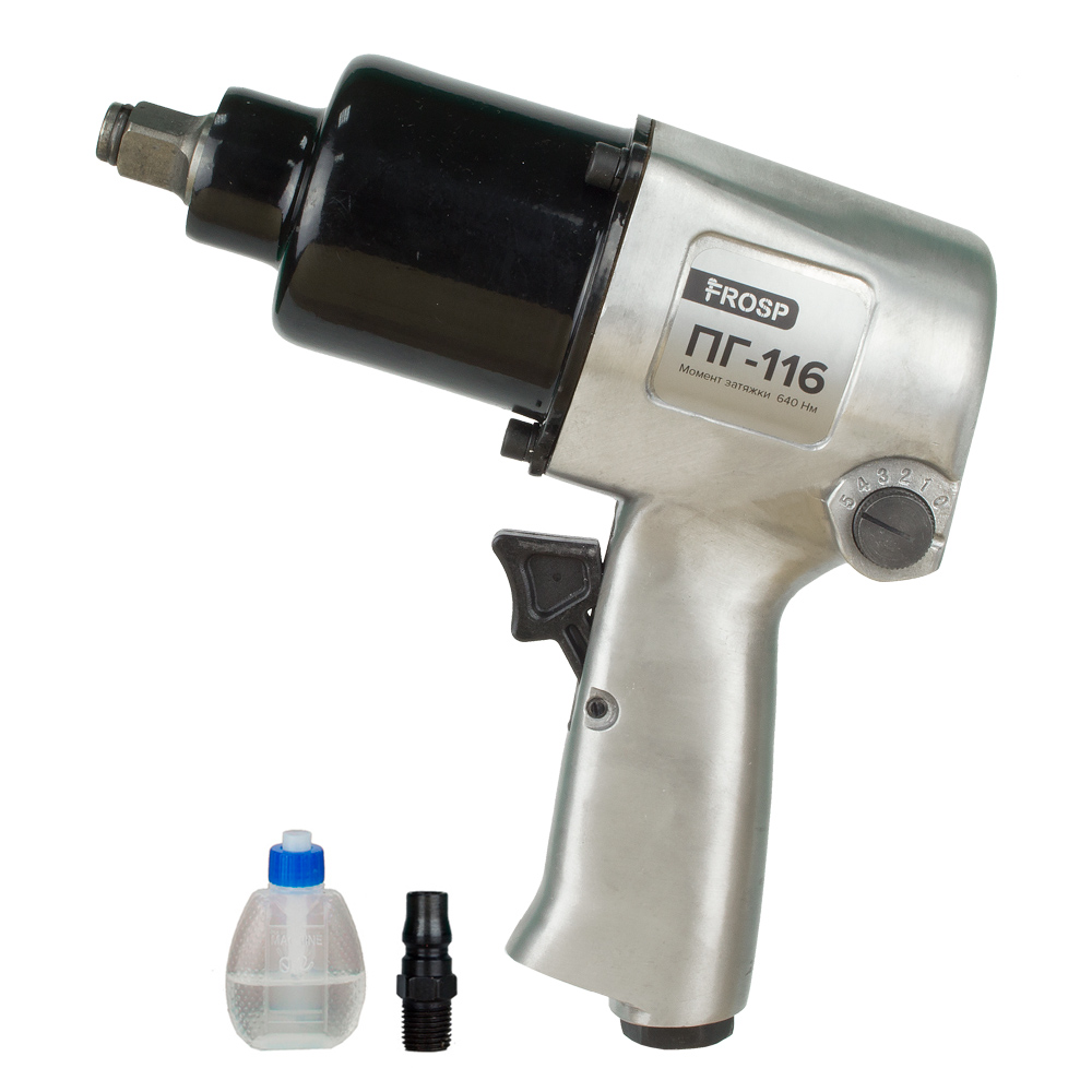 Модель FROSP ПГ-116 имеет квадрат шпинделя 1/2 дюйма. Есть функция реверса, а также регулировки момента затяжки. Этот пневмогайковерт можно назвать самым популярным в своем сегменте. Он сочетает в себе хорошую работу, длительный срок эксплуатации, доступную цену.