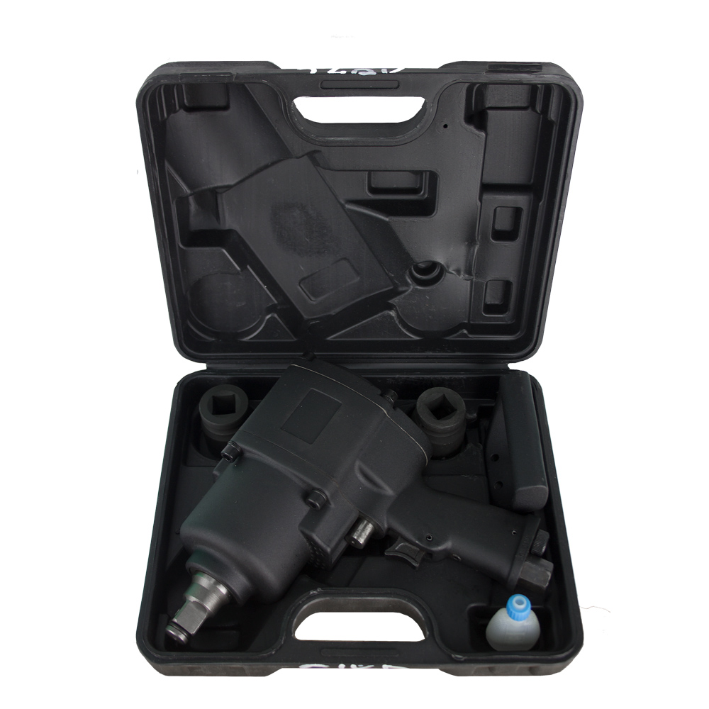 Пневмогайковерт реализуется в кейсе. Гайковерт укомплектован масленкой и двумя торцевыми головками с квадратом шпинделя 3/4 дюйма. Размер головок покупатель вправе выбрать на свое усмотрение, в стоимость комплекта входят любые две головки размером под ключ от 17 до 36 мм.